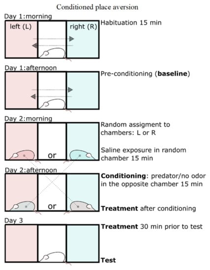 - Albrechet-Souza, L.; Gilpin, N.W. The predator odor avoidance model of post-traumatic stress disorder in rats. Behav. Pharmacol. 2019, 30, 105–114. [Google Scholar] [CrossRef] [PubMed]