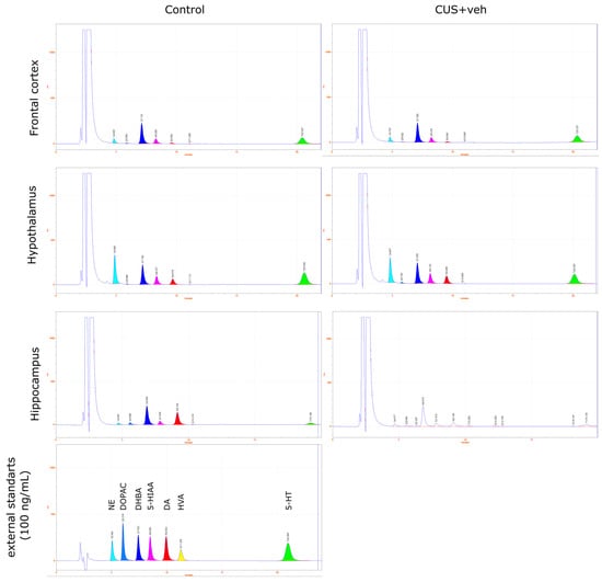 Example chromatograms of monamines NE, DA, and 5-HT and their metabolites (DOPAC, 5-HIAA, and HVA) extracted from the frontal cortex, hypothalamus, and hippocampus after CUS exposure and vehicle treatment.