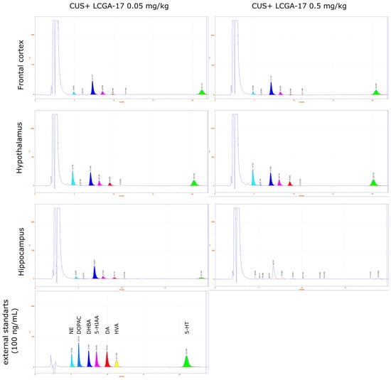 Example chromatograms of monamines NE, DA, and 5-HT and their metabolites (DOPAC, 5-HIAA, and HVA) extracted from the frontal cortex, hypothalamus, and hippocampus after CUS exposure and treatment with LCGA-17 (0.05 mg/kg and 0.5 mg/kg).