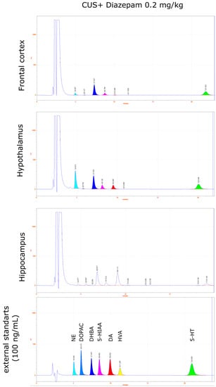 Example chromatograms of monamines NE, DA, and 5-HT and their metabolites (DOPAC, 5-HIAA, and HVA) extracted from the frontal cortex, hypothalamus, and hippocampus after CUS exposure and treatment with diazepam (0.2 mg/kg).