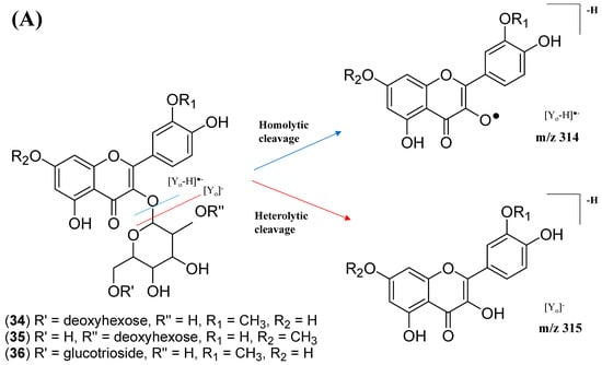 The node with the precursor ion at m/z 623.1410 [M-H]− was identified as isorhamnetin-3-galactoside-6″-rhamnoside (34), while m/z 639.2764 [M-H]− was annotated as rhamnetin-3-O–gentiobioside (35), which was consistent with the GNPS library. Although there is no general approach for analyzing the exact position of the methoxy substituent on the flavonol core structure, the masses of the A-ring fragments can be used to determine whether the methoxy group is attached to the A or B ring [47]. The existence of isorhamnetin and rhamnetin as the aglycone units of these compounds can be further confirmed based on the formation of fragment ions that arise from the cleavage of ring C of the mono-methoxylflavonol at positions 1 and 3, via the retro-Diels–Alder (RDA) mechanism, [1,3A]− and the fragment ion of [0,4A]−. Specifically, these fragment ions appeared at m/z 107 [0,4A]− and 151 [1,3A]− for isorhamnetin, while at m/z 121 [0,4A]− and 165 [1,3A]− for rhamnetin. A further loss of a 15 Da (CH3), accompanied by CO (28 Da) and HCO (29 Da), indicated the presence of methoxy group in their parent structures [30,31,32]. The spectra show cross-ring cleavage of the mono-methoxyl sub-structure, which can be seen from the proposed fragmentation mechanism in Figure 13B,C. In addition, a node with a precursor ion at m/z 769.2203 [M-H]− was putatively characterized as a tri-glucoside isorhamnetin, namely 3-((6-(((3,5-dihydroxy-6-methyl-4-((3,4,5-trihydroxy-6-methyltetrahydro-2H-pyran-2-yl)oxy)-tetra-hydro-2H-pyran-2-yl)oxy)-methyl)-3,4,5-trihydroxytetrahydro-2H-pyran-2-yl)oxy)-5,7-di-hydroxy-2-(4-hydroxy-3-methoxy-phenyl)-4H-chromen-4-one (36). The fragment ion showed the loss of a sugar unit, resulting in the mass fragment ion of m/z 605. The fragment ion at m/z 314 as the base peak confirmed the resemblance of the structure to isorhamnetin after the loss of another sugar moiety.