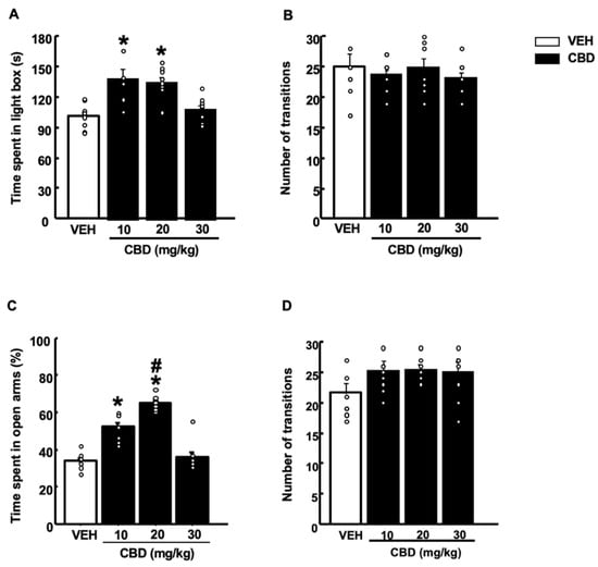 Effects of a single administration of cannabidiol (CBD) (10, 20 and 30 mg/kg, i.p.) on anxiety-like behaviors in the light-dark box (A,B) and elevated plus maze (C,D) paradigms. The behavioral evaluation was developed 1 h and 30 min after the administration of CBD (or vehicle (VEH)). Columns represent the means and vertical lines ± SEM of (A) the time in the lighted box (s); (B) the number of transitions in the light-dark box test; (C) the percentage of time in the open arms (%); and (D) the number of transitions in the elevated plus-maze test. * Values from CBD-treated mice that were different (p < 0.05) from VEH-treated mice and # values from CBD-20 mg/kg-treated mice that were different from CBD-10 mg/kg-treated mice (one-way ANOVA followed by Student–Newman–Keuls test, p < 0.05).