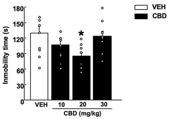 Treatment with CBD significantly reduced the immobility time at a dose of 20 mg/kg. Interestingly, the lower and the higher doses of CBD (10 and 30 mg/kg) did not induce any effects (Figure 2, One-way ANOVA followed by Student–Newman–Keuls test, F(3,38) = 3.364, p = 0.029) (n = 9–10/group).