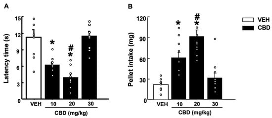 Effect of a single administration of cannabidiol (CBD) (10, 20 and 30 mg/kg, i.p.) on anxiety-like behaviors in the novelty suppressed feeding test. The behavioral evaluation was developed 1 h and 30 min after the administration of CBD (or vehicle (VEH)). Columns represent the means and vertical lines ± SEM of (A) latency time (s) and (B) pellet intake (mg). * Values from CBD-treated mice that were different (p < 0.05) from VEH-treated mice, and # values from 20 mg/kg of CBD-treated mice that were different from mice treated with the lower dose of CBD (10 mg/kg) (one-way ANOVA followed by Student–Newman–Keuls test, p < 0.05).