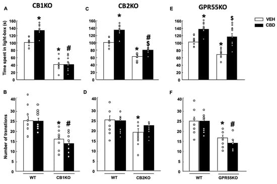 Effects of a single administration of cannabidiol (CBD) at a dose of 20 mg/kg (i.p.) on anxiety-like behaviors in the light-dark box in mice lacking the cannabinoid receptor 1 (CB1KO) (A,B), lacking the cannabinoid receptor 2 (CB2KO) (C,D), and lacking the G-protein-coupled receptor 55 (GPR55KO) (E,F) mice. The behavioral evaluation was developed 1 h and 30 min after the administration of CBD (or vehicle (VEH)). Columns represent the means and vertical lines ± SEM of the time in the lighted box (s) (A,C,E) and the number of transitions (B,D,F). Results from CD1 VEH and CBD (20 mg/kg) groups have been included for comparative purposes. * Values from groups that were different from wild-type (WT)-VEH treated mice (two-way ANOVA followed by Student–Newman–Keuls test, p < 0.05). $ Values from groups that were different from KO-VEH treated mice (two-way ANOVA followed by Student–Newman–Keuls test, p < 0.05). # Values from groups that were different from WT-CBD-treated mice (two-way ANOVA followed by Student–Newman–Keuls test, p < 0.05).