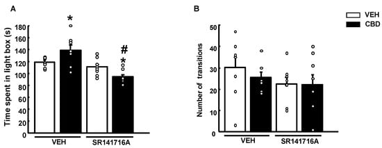 Effects of a single administration of cannabidiol (CBD) (20 mg/kg, i.p.) in mice pre-treated with the cannabinoid receptor 1 (CB1r)-antagonist SR141716A (2 mg/kg, i.p.) on the light-dark box test. The behavioral evaluation was developed 2 h after SR141716A (or vehicle) and 1 h and 30 min after the administration of CBD (or vehicle (VEH)). Columns represent the means and vertical lines ± SEM of the time in the lightbox (s) (A) and the number of transitions (B). * Values from CBD-treated mice that were different (p < 0.05) from vehicle (VEH)-treated mice, and # values from SR141716A + CBD-treated mice that were different from VEH + CBD and SR141716A + VEH-treated animals (two-way ANOVA followed by Student–Newman–Keuls test, p < 0.05).