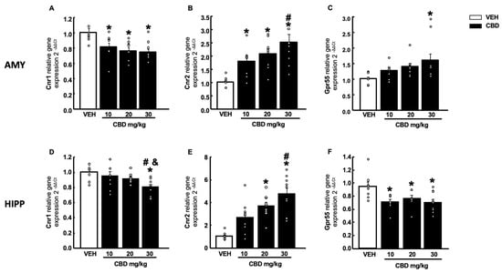 Effects of a single administration of cannabidiol (CBD) (10, 20 and 30 mg/kg, i.p.) on the relative gene expression of cannabinoid receptor 1 (Cnr1), cannabinoid receptor 2 (Cnr2) and G-protein-coupled receptor 55 (GPR55) in the amygdala (AMY) (A–C) and hippocampus (HIPP) (D–F). Columns represent the means and vertical lines ± SEM of the relative gene expression (2-ΔΔCt). * Values from CBD-treated mice that were different from vehicle (VEH)-treated mice, and # values from 30 mg/kg of CBD-treated mice that were different from the lower dose of CBD (10 mg/kg) treated animals. & Values from 30 mg/kg of CBD-treated mice that were different from the CBD (20 mg/kg) treated mice (one-way ANOVA followed by Student–Newman–Keuls test, p < 0.05).