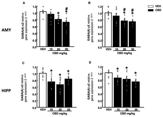 Effects of a single administration of CBD (10, 20 and 30 mg/kg, i.p.) on the relative gene expression of GABA(A) α2 and γ2 in the amygdala (AMY) (A,C) and hippocampus (HIPP) (B,D). Columns represent the means and vertical lines ± SEM of the relative gene expression (2-ΔΔCt). * Values from CBD-treated mice that were different from vehicle (VEH)-treated mice and # values from CBD (20 or 30 mg/kg)-treated mice that were different from the lower dose of CBD (10 mg/kg) treated animals (one-way ANOVA followed by Student–Newman–Keuls test, p < 0.05).