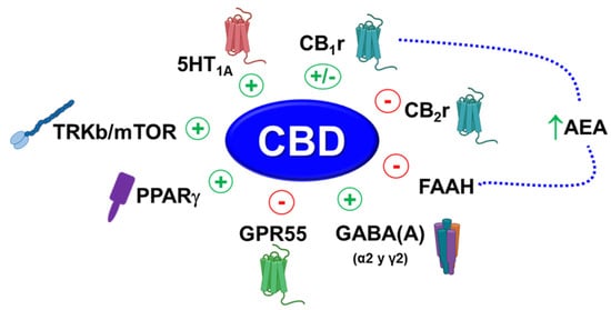 Cumulative evidence supports the role of cannabinoid receptors (CB1 and CB2) in regulating the response to stress, anxiety, depression, schizophrenia and in cognition [,,,,,,]. Interestingly, both cannabinoid receptors are associated with significant alterations in the expression of anxiolytic-mediated subunits of the GABA(A) receptor [,,] and with the anxiolytic action of benzodiazepines [,]. More recently, additional receptors on which endocannabinoids also act, such as the GRP55 receptor, have been associated with the regulation of emotional reactivity [,,] and hippocampal plasticity []. Interestingly, previous studies have demonstrated that CBD modifies the gene expression of these targets in animal models of PTSD [], alcohol consumption [,] and spontaneous cannabinoid withdrawal [], in which CBD showed efficacy.