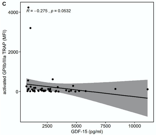 There was a trend towards a correlation of GDF-15 with the platelet surface expression of activated glycoprotein (GP) GPIIb/IIIa in response to thrombin receptor-activating peptide (TRAP) (r = −0.275, p = 0.0532) but not in response to arachidonic acid (AA) (r = −0.133, p = 0.3572) or adenosine-diphosphate (ADP) (r = −0.0855, p = 0.5537), as shown in Figure 2.