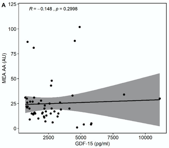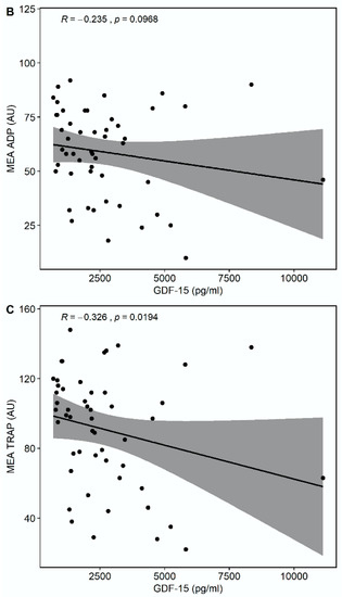 Median multiple electrode aggregation (MEA) AA was 20 AU (IQR 14–28), median MEA ADP was 60 AU (IQR 48–74), and median MEA TRAP was 98 AU (IQR 67–114). GDF-15 correlated inversely with MEA TRAP (r = −0.326, p = 0.0194), whereas the correlation of GDF-15 with MEA ADP (r = −0.235, p = 0.0968) and MEA AA (r = −0.148, p = 0.2998) did not reach statistical significance (Figure 3). GDF-15 did not correlate with soluble P-selectin (r = −0.062, p = 0.626).