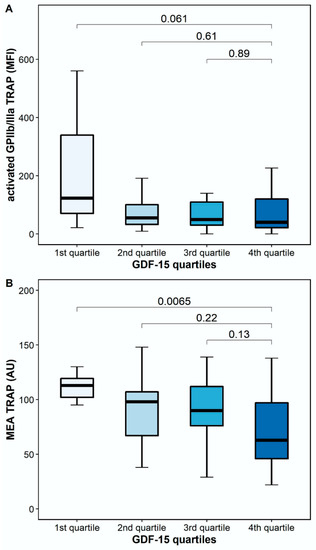 The platelet surface expression of activated GPIIb/IIIa in response to TRAP was numerically lower, but it did not differ significantly between patients with high and low GDF-15 (40.5 MFI [IQR 17.6–128.6] vs. 123.6 MFI [IQR 48.4–487.1], p = 0.061). However, TRAP-inducible platelet aggregation by MEA was significantly lower in patients with high GDF-15 compared to patients with low GDF-15 (63 AU [IQR 41–102] vs. 113 AU [IQR 102–120], p = 0.0065; Figure 4).