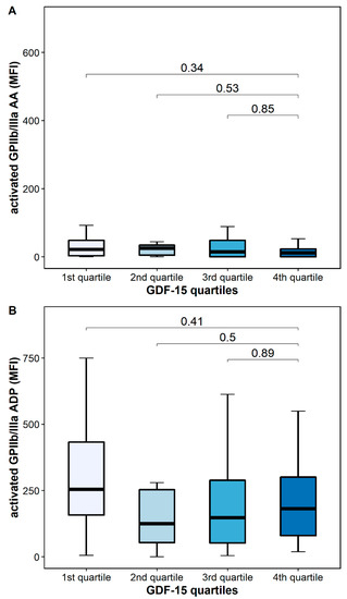Platelet activation according to GDF-15 quartiles. (A) Activated GPIIb/IIIa in response to arachidonic acid (AA). (B) Activated GPIIb/IIIa in response to adenosine diphosphate (ADP). The boundaries of the box show the lower and upper quartile of data, and the line inside the box represents the median. Whiskers were drawn from the edge of the box to the highest and lowest values that are outside the box but within 1.5 times the box length.