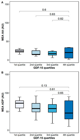 AA-inducible platelet aggregation by MEA was similar in patients with high and low GDF-15 (24 AU [IQR 20–30] vs. 20 [5–34], p = 0.6), whereas ADP-inducible platelet aggregation by MEA was numerically higher in patients with low GDF-15 (76 AU (54–82] vs. 46 AU [27–80], p = 0.13) (Figure 6).