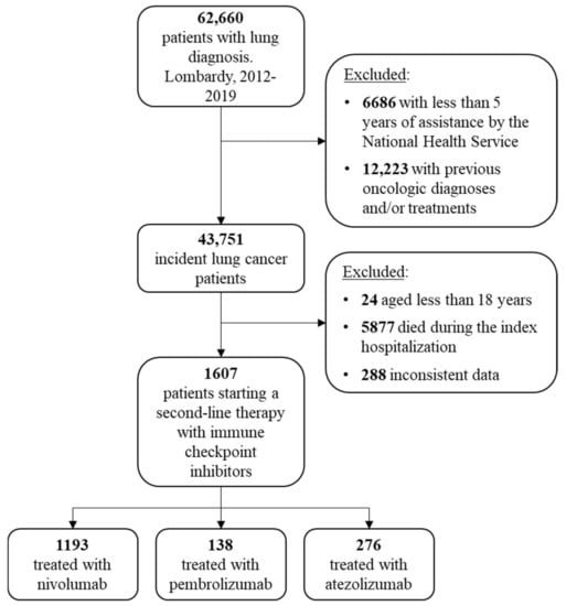 Details of the selection criteria of the study cohort are reported in a recent publication, in which we investigated therapeutic pathways, clinical outcomes and healthcare costs of advanced NSCLC patients treated with first-line target therapies and immune checkpoint inhibitors in the Lombardy Region [17]. Briefly, the target cohort included 37,562 patients residing in Lombardy and beneficiaries of the NHS, aged 18 years or more, with a new diagnostic code for lung cancer during the years 2012 to 2019. Among these, all patients from the target cohort who started their treatment with pembrolizumab (ATC L01XC18), nivolumab (ATC L01XC17) or atezolizumab (ATC L01XC32) within 30 June 2020 were identified. In Italy, at the time of the end of the study cohort recruitment, nivolumab and atezolizumab were only indicated as second-line treatments of advanced NSCLC after the failure of a chemotherapy-based first-line treatment, while pembrolizumab was also indicated as a first-line treatment option [6]. Thus, in order to ensure that pembrolizumab was administered as a second-line treatment, only patients who underwent chemotherapy within six months before the date of the first pembrolizumab administration were included in the final study cohort. Patients were followed-up from the date of start of the second-line treatment with either nivolumab, pembrolizumab or atezolizumab (which we named “index date”) until 31 December 2020.