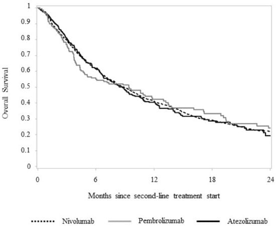 After a mean follow-up of 10.5 months, 899 (75.4%) deaths were observed among patients treated with nivolumab, 92 (66.7%) in patients treated with pembrolizumab and 189 (68.5%) in those treated with atezolizumab. No differences in OS were observed between treatment arms, median OS or RMST (Figure 2). The median OS was 8.9, 9.4 and 8.7 months, respectively, in patients treated with nivolumab, pembrolizumab and atezolizumab (p = 0.898). Corresponding figures of RMST were 11.4, 11.5 and 11.3 months, respectively (p = 0.980).