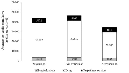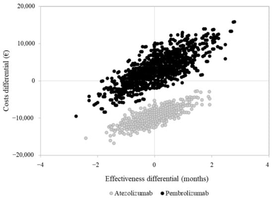 Overall costs were EUR 43,764, 46,233 and 34,116, on average, for a patient treated with nivolumab, pembrolizumab and atezolizumab, respectively. The average cost for a patient treated with nivolumab included EUR 3670 for hospitalization, EUR 35,022 for drugs (of which EUR 33,311 is for nivolumab) and EUR 5072 for outpatient services. Corresponding figures for a patient treated with pembrolizumab and atezolizumab were EUR 3683, 37,580 (EUR 36,270 for pembrolizumab) and 4960, and EUR 3092, 26,206 (EUR 24,965 for atezolizumab) and 4818, respectively. The cost-effectiveness profile is shown in Figure 4.