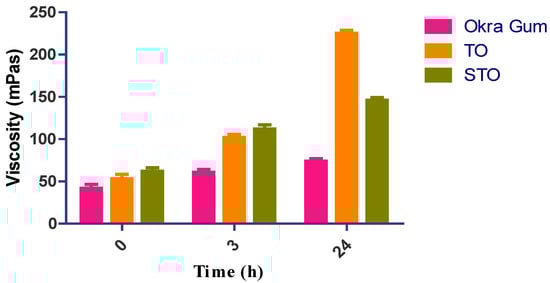 The rheological examination was conducted on a combined plate-plate rheometer to evaluate the viscoelasticity of every polymer sample and, accordingly, an interpretation of their cytotoxicity could also be correlated. As a result of adding thioglycolic acid to okra gum, the thiomers’ dynamic viscosity improved by at least 1.67-fold (TO); 2.66-fold (STO) in 3 h. Surprisingly, a 5.35-fold increase in the viscosity was noted for TO after 24 h of study, and no significant changes were identified in the viscosity of okra gum and the S-protected thiomers. At physiological pH following a definite time, thiolated polymers can undergo oxidation and may form intramolecular disulfide bonds. Due to this cross-linking, their viscoelastic properties get altered concerning the function of time. Additionally, it may be noted that the higher the number of immobilized thiol moieties on the polymer, the more significant the improvement in viscosity, which was found to be similar to the results of Sakloetsakun et al. [21]. However, in STO, because of the fewer free and connected thiol groups, this disulfide bond cannot be formed to a similar degree as their corresponding thiomers. Kafedjiiski et al. demonstrated that thiol groups could rapidly form disulfide bonds due to proximity compared to isolated residual thiol groups [22]. This study’s results with regard to apparent viscosity are shown in Figure 2.