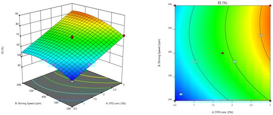 The process parameters chosen were STO (X1) concertation and stirring speed (X2) at five stages coded as −1.414, −1, 0, +1, and +1.414. These variables were standardized for entrapment efficacy (EE) (Y1) and in vitro mucoadhesion nature (Y2). Design Expert V.12 was used to implement the central composite model, providing 15 experimental trials. Table 7 depicts the entire work plan interns of coded and real values of selected variables and restrains of dependent factors [30]. Quadratic regression was applied to measure the response in every trial, and an investigation was performed.