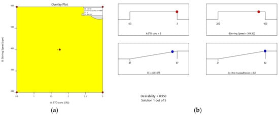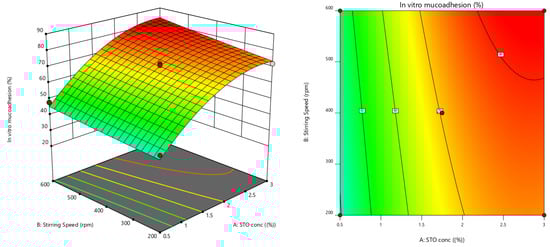Furthermore, the effect of individual modifiers on responses was scrutinized and illustrated by RSM [24]. Figure 3 contains the response’s relation with the variables, a contour plot that ensures the variable effects. RSM was used to determine and explain the effect of the nondependent variables on the obtained individual responses. Three-dimensional response surface graphs are critical to demonstrate the interaction and the main effect. The acquired responses are visualized by employing contour plots [25]. The global desirability (D) function optimized the model order. Every response was laid a limit to the maximum to obtain an inlay graph to augment the nondependent variables. All three possible independent variables were encompassed in the design for optimization. The independent variables (optimal level) represented a maximum of 0.950 desirabilities (Figure 4a) value for both responses in the desirability function plot (Figure 4b). Hence, implementation of this setting aids in obtaining the EE of 83.11% and in vitro mucoadhesion of 82%. By using these optimized concentrations a G-STO-M formulation was formulated. For comparative purposes, a similar formulation (G-TO-M) was prepared using TO instead of STO.