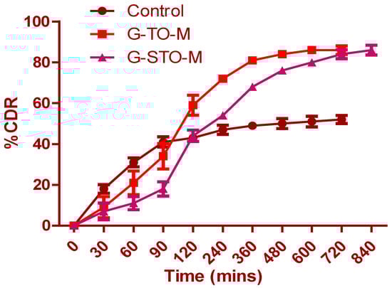Figure 6 shows that drug release from pure glibenclamide (control), G-TO-M, and G-STO-M was highly dependent on TO and STO concentrations. Drug release from the control formulation was incomplete, and it was observed that only 47.23% of glibenclamide was released at the end of 240 min. Subsequently, there was no significant change in the release. A similar drug release pattern was observed with TO and STO microsphere formulations. However, the formulation contained an S-protected polymer that showed more controlled and complete drug release by the end of 840 min due to the formation of a hydrogel network upon hydration. STO concentration in the microspheres led to increased thickening of the coat enclosing the drug particles, thus increasing the distance traveled in drug release. The increased polymer quantity by forming a hydrogel network can result in low porosity of the polymeric phase and impedes burst release.