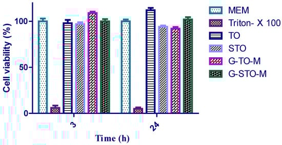 Cell viability analysis of TO, STO, G-TO-M, and G-STO-M was conducted on the Caco-2 cell cultures using a Resazurin assay to determine cytotoxicity. Resazurin is a weakly fluorescent blue dye that indicates cell viability; it can be reduced irreversibly by living cells to resorufin, which is characterized by pink color and high fluorescence. It is primarily employed for in vitro cytotoxicity studies to determine cellular metabolic activity. Resorufin can easily be identified by fluorimetry with 540 and 590 nm emission wavelengths. Cells were given with the above samples for 3 and 24 h. The results were depicted as histograms in Figure 7, demonstrating that all the thiolated S-protected polymers and their formulations were not cytotoxic as the cell viability was very high. Additionally, no remarkable differences were noted after 3 and 24 h. Following 24 h of incubation, statistically significant differences regarding cell viability were noted for the microsphere referred to 3 h of incubation. Presuming that a polymer exhibits a higher number of covalently bound thiol groups, closer thiol moieties on the same chain can react rapidly among themselves rather than with thiols on other polymer chains. This could be owed to the higher viscoelastic characters of thiomers and their subsequent reduction in cell viability. Hence, the newly prepared S-protected polymer could be viewed as safe for in vivo usage.