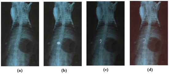 X-ray radiograms (a) before administering (b–d), showing mucoadhesion of G-STO-M at 1, 4, and 8 h, correspondingly.