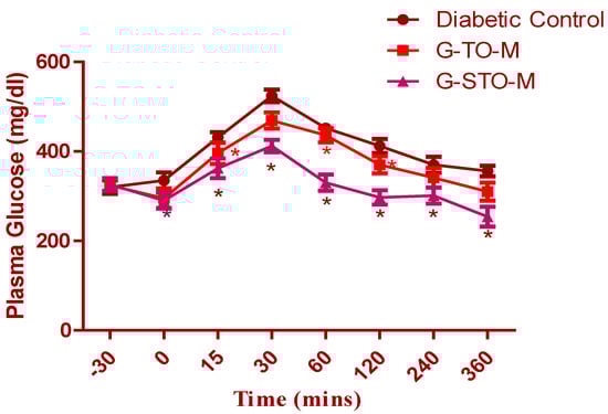 The glucose tolerance test was conducted on diabetic (alloxan-induced) rats (Figure 9). The data is represented as mean ± SEM (n = 6). Considerable deviations were noted in the groups upon statistical validation with one-factor ANOVA and subsequent Dunnett’s test for multiple comparisons (* p < 0.05). The G-STO-M formulation exhibited excellent control of plasma sugar levels due to better penetration of glibenclamide, as a consequence of improved permeability characters by the S-protected thiomer.
