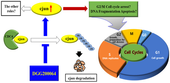 We demonstrated growth inhibition of colorectal cancer through the G2/M phase arrest by DGG200064. Our results confirmed a dose-dependent increase of c-Jun, phosphorylated c-Jun, and cyclin B1 with DGG200064 treatment. We indicated that the increase in the G2/M phase arrest marker, cyclin B1, is regulated by c-Jun; and c-Jun protein degradation is regulated by an E3 ligase FBXW7. Moreover, our results confirmed that DGG200064 selectively inhibited c-Jun ubiquitination by FBXW7 in colon cancer cell lines: DGG200064 binds to FBXW7 (aa 626–689) and inhibits its interaction with c-Jun.