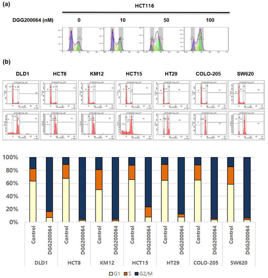 FACS analysis of the induced G2/M cell cycle arrest by DGG200064: (a) The DGG200064 induced G2/M cell cycle arrest in HCT116 cells in a dose-dependent manner for 6 h; (b) Various colon cancer cells treated with DGG200064 (50 nM) for 6 h.