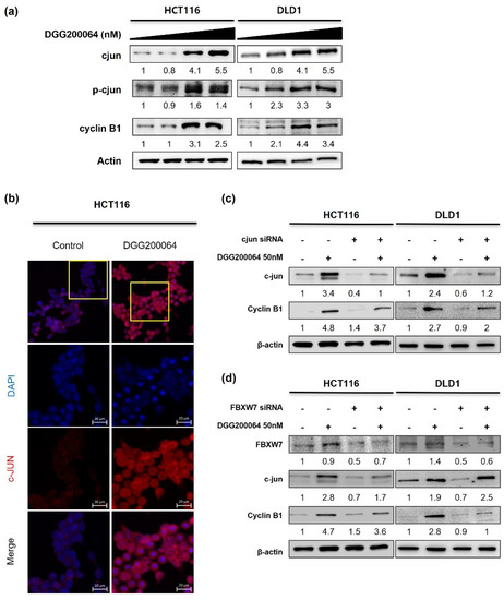 HCT116 and DLD1 cells were exposed to increasing concentrations of DGG200064 (0, 10, 50, 100 nM) for 6 h. Immunoblotting showed a dose-dependent increase in cyclin B1, c-Jun, and p-c-Jun by DGG200064 (Figure 3a). Moreover, there were increased levels of c-Jun by DGG200064 (50 nM) treatment in other 6-colon cancer cells (Figure S1, Supplementary Materials). c-Jun is a component of the transcription factor activator protein 1 (AP-1), which is activated by a variety of extracellular stimuli, such as growth factors and UV irradiation. In cancer cells, activation of c-Jun promotes down-stream target gene transcription, and it is involved in cell proliferation, growth, division, and apoptosis [41]. Immunocytochemical staining of c-Jun in the presence of DGG200064 (50 nM) showed increased levels of c-Jun level in HCT116 cells (Figure 3b). To test whether DGG200064 could induce G2/M cell cycle arrest through the increasing of c-Jun level, the two genes were silenced using c-Jun siRNAs and treated with DGG200064 in HCT116 and DLD1 cells (Figure 3c). When c-Jun was silenced, the amount of cyclin B protein treated by DGG200064 decreased. This result suggests that G2/M cell cycle arrest is induced by c-Jun, which is increased by the effect of DGG200064. Next, we investigated if the c-Jun stabilization was induced through inhibition of protein degradation by DGG200064. Combined treatment with both siRNA for FBXW7 (E3 ligase of c-Jun) and DGG200064 resulted in changes for both c-Jun and cyclin B in HCT116 and DLD1 cells (Figure 3d). c-Jun and cyclin B1 were not observed after treatment with DGG200064. This finding suggested that DGG200064 inhibited the degradation of c-Jun by the E3 ligase, FBXW7.