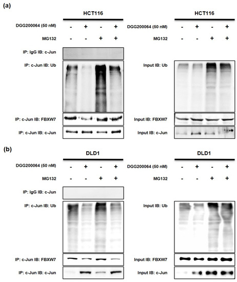 To investigate whether the ubiquitination of c-Jun is suppressed through the inhibition of c-Jun and FBXW7 binding by DGG200064, c-Jun immunoprecipitation was done to observe protein–protein interaction (Figure 4). E3 ligase, such as FBXW7, binds the protein to the ubiquitin chain through covalent bonds and rapidly degrades the protein through 26S proteasome [42]. When treated with MG132 as a proteasome inhibitor, the ubiquitination of c-Jun increased compared to both control HCT116 and DLD1 cells. In contrast, the c-Jun ubiquitination was inhibited by DGG200064. The binding between c-Jun and FBXW7 was reduced with DGG200064 treatment. The FBXW7 protein, also known as CDC4, is a component of the SCF complex ubiquitin ligase and is known as a modulator of several substrates including cyclin E, c-Myc, c-Jun, and Notch [43]. To check the selectivity of DGG200064 towards FBXW7 substrates, the change of c-Jun, cyclin E, and c-Myc by DGG200064 was analyzed. After treatment with DGG200064 (0, 10, 50, 100 nM) for 6 h in HCT116 cells, immunoblotting showed an increased level of c-Jun but the cyclin E and c-Myc levels were not affected (Figure S2a, Supplementary Materials). Cyclin E immunoprecipitation was done to test whether the ubiquitination of cyclin E by FBXW7 is inhibited by DGG200064 in HCT116 (Figure S2b, Supplementary Materials). There were no changes in cyclin E ubiquitination with DGG200064 treatment. DGG200064 was found to selectively inhibit the ubiquitination of c-Jun by interrupting the binding between FBXW7 and c-Jun.