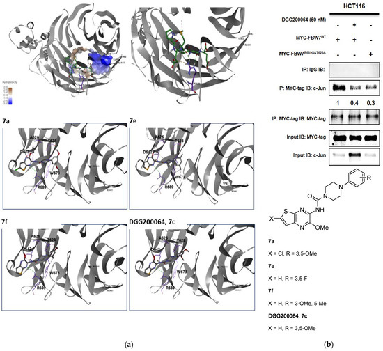 Identification of the interaction inhibition site between FBXW7 and c-Jun: (a) Docking modes and interactions of c-Jun, 7a, 7e, 7f, and DGG200064 at the binding site of FBXW7. Electrostatic, hydrogen bond, alkyl, and pi-sigma interaction are displayed as orange, green, pink, and purple dashed lines, respectively; (b) HCT116 cells transfected with MYC-FBXW7WT, MYC-FBXW7R689G&T628A for 24 h, and then treated with DGG200064 for 6 h. The cell extracts were immunoprecipitated with an MYC-tag antibody and subjected to immunoblotting with antibodies to c-Jun and Myc-tag.