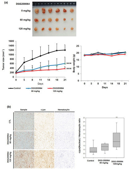 In vivo evaluation of the DGG200064 suppressed colon cancer tumor growth against HCT116 cells. (a) HCT116 cell suspensions were injected subcutaneously into 6 weeks old female nude BALB/c mice. When the tumors reached a volume of 100 mm3, treatment with DGG200064 was started. (b) Colon cancer tumors harvested from nude BALB/c mice were analyzed by immunohistochemical staining with Hematoxylin and c-Jun antibodies. After the treatment with DGG200064, 0.1 mL BrdU in sterile DPBS was injected intraperitoneally. Then, 2 h later, the animals were anesthetized, perfused with PBS, and killed. The colon cancer tumors were then excised ** p < 0.01, *** means p-value.