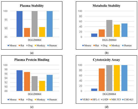 Pharmacological analysis of representative lead compounds DGG200064: (a) Plasma Stability (% remaining after 4 h incubation in plasma); (b) Metabolic Stability (liver microsomal phase I stability, % of remaining after 30 min incubation); (c) Plasma protein binding (%, the rate at 5 µM); (d) Cytotoxicity Assay (IC50, µM): IC50 ≥ 10 reffers safe for cytotoxicity.