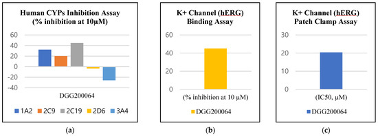 Inhibition analysis of lead compounds DGG200064: (a) Human CYPs inhibition assay (% inhibition at 10 µM); (b) K+ Channel (hERG) binding assay: % inhibition ≤ 50 means safe for hERG channel inhibition; (c) K+ Channel (hERG) Patch Clamp assay: IC50 ≥ 10 means safe for hERG channel inhibition.