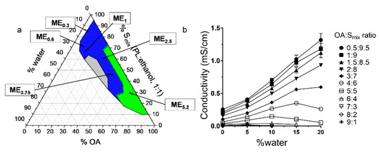 Concluding, formulations that were characterized as MEs had always less than approximately 20% of water content regardless of the OA: Smix ratio. Furthermore, MEs were divided into o/w, bicontinuous or w/o according to their conductivity values. More specifically, MEs with low OA content and OA/Smix ratios of 0.5:9.5–2:8 were characterized as o/w (Figure 1a—included in the grey region). MEs with medium OA/Smix ratios ranging between 3:7–5:5 were characterized either as o/w (when water contact was around 15%, Figure 1a—included in the grey region), bicontinuous (when water content was 5–15%, Figure 1a—blue region) or w/o (when water content was <5%, Figure 1a—included in green region). Finally, MEs with high OA/Smix ratios (6:4–9:1) were characterized as w/o (Figure 1a—included in the green region).