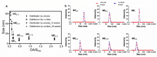 DLS characterization of MEs. (a) Effect of OA: Smix on the size of the selected MEs immediately after preparation and 10 weeks later. Data are presented as distribution by volume and number as the means ± SD, n = 3. (b) Size distributions profiles.