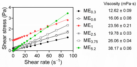 Rheograms of selected MEs, obtained by plotting shear stress versus the shear rate, show Newtonian behaviour for ME0.3, ME2.5, ME3.75, and ME5.2, and Bingham behaviour for ME0.6 and ME1 (R2 > 0.99). The ME viscosities are shown as the means ± SD, n = 3.