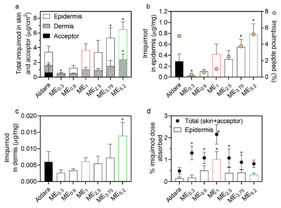 Importantly, none of the prepared MEs delivered IMQ into the acceptor phase in detectable concentrations, in contrast to Aldara (Figure 4a). Although in vitro permeation experiments cannot fully predict the in vivo systemic drug absorption, these results suggest that our IMQ-loaded MEs have a decreased risk of systemic side effects, previously reported for the commercially available products [4].