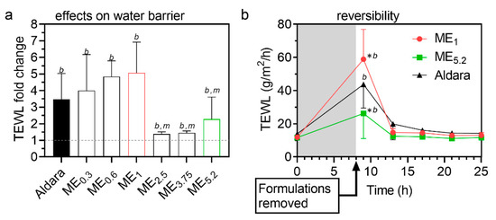 Interaction of selected MEs with the skin barrier. (a) TEWL fold change after/before treatment. Formulations were applied for 8 h and then carefully removed. TEWL values were obtained 1 h later to prevent interference with formulation residues. Data are presented as the means ± SD, n ≥ 4. b significant against baseline value (before treatment), m significant against ME1 at p < 0.05. (b) Rapid reversibility of TEWL values after cessation of treatment with selected formulations. Means ± SD, n ≥ 4. * Significant against Aldara at the same time point; b significant against baseline value (before treatment) at p < 0.05.