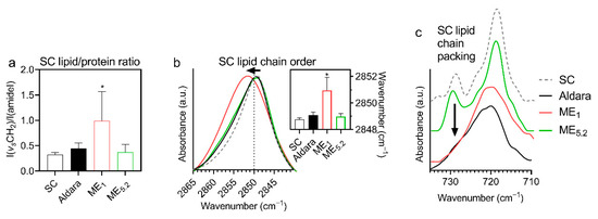 In addition, human SC lipids are primarily arranged in a tight orthorhombic packing, which is vital for restricting water loss [57]; this chain packing can be detected as the correlation field splitting of the scissoring or rocking methylene bands. The rocking doublet at around 730 and 718 cm−1 is usually well resolved in the complex SC samples. Figure 6c shows the disappearance of the 730 cm−1 doublet component in the ME1 and Aldara-treated samples, indicating a disruption of the tight orthorhombic lipid packing [58]. The doublet persisted in most of the ME5.2-treated samples. These data are consistent with the formulations’ effects on TEWL.