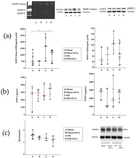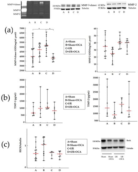 The evaluation of TIMP levels showed no significant differences among all groups considered and the same occurred for RECK. In our research, we also determined the content of both TIMP-1, the specific inhibitor of MMP-9, and TIMP-2, the inhibitor of MMP-2. Both inhibitors showed no significant differences among all groups tested. Usually, TIMP concentration is opposite to MMP. However, in our study, we found increased concentrations of both MMP-9 and TIMP-1, although not significant for the latter; this could result from failure of TIMP-1 inhibition. Furthermore, TIMP transcription is regulated by the same cytokines and growth factors controlling MMP expression []. The TIMP-2 concentration in the I/R group did not have a statistically significant influence but it showed, as expected, a negative trend in contrast with MMP2.