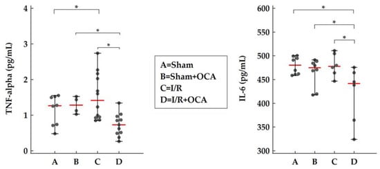 The effect of OCA on kidney TNF-alpha and IL-6 levels was evaluated by ELISA. At the end of reperfusion, OCA administration caused a significant decrease in both TNF-alpha and IL-6 in the kidney cortex of OCA-treated I/R rats compared to I/R rats (Figure 4). Undetectable levels of TNF-alpha were found in the kidney medulla in all groups considered. No changes in the IL-6 kidney medulla were found (Figure S1, supplementary materials).