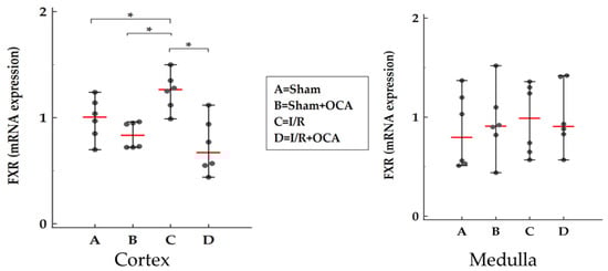 FXR expression in kidney cortex and medulla in rats submitted to partial liver ischemia (60 min) followed by reperfusion (120 min). Animals were orally administered with OCA 10 mg/kg/day in methylcellulose 1% for 5 days (n = 12) or with vehicle alone (n = 12). Sham-operated animals were subjected to the same procedure without clamping the vessels. n = 6 rats/group. Results are expressed as median value (red line) ± error bar (1–99 percentiles) (black dot). One-way ANOVA with Tukey–Kramer test; * p < 0.05 versus I/R rats.