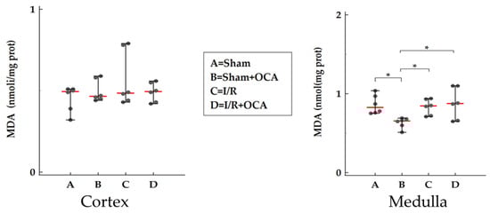 TBARS formation in kidney cortex and medulla in rats submitted to partial liver ischemia (60 min) followed by reperfusion (120 min). Animals were orally administered with OCA 10 mg/kg/day in methylcellulose 1% for 5 days (n = 12) or with vehicle alone (n = 12). Sham-operated animals were subjected to the same procedure without clamping the vessels. n = 6 rats/group. TBARS concentrations were calculated using malondialdehyde (MDA) as standard. Results are expressed as median value (red line) ± error bar (1–99 percentiles) (black dot). One-way ANOVA with Tukey–Kramer test (Medulla); Kruskal–Wallis test with Conover test (Cortex). * p < 0.05 versus I/R rats.