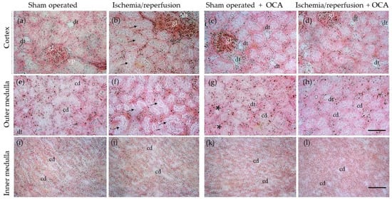Histological patterns of kidneys (cortex and outer and inner medulla) collected from rats orally administered 10 mg/kg/day OCA in methylcellulose 1% for 5 days (n = 12) or vehicle alone (n = 12), and then submitted to partial liver ischemia (60 min) followed by reperfusion (120 min). Sham-operated animals were subjected to the same procedure without clamping the vessels. Cryostatic tissue sections are stained by conventional H&E procedure. (a–d) In the cortex the intensely stained glomeruli, or renal corpuscles, (gl) exhibit their typical rounded shape. In (a) the vascular pole (vp) is also easily appreciable. Distal tubules (dt) can be recognized for their much less eosinophilia than the proximal ones. (e–h) Cross-sections of medulla are characterized by collecting ducts (cd), larger than distal tubules (dt) and segments of the loop of Henle (asteriscs). (i–l) In the longitudinal sections of medulla, arrays of nuclei facing larger, empty spaces identify collecting duts (cd). Ischemia-reperfusion affects in particular the tubules in the cortex and outer medulla of rats without OCA administration, for which the lumen appears to be enlarged and filled with amorphous material (arrows). Bars: (a–h) 80 μm; (i–l) 50 μm.