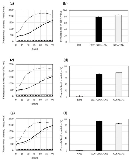 The ability of antibiotics (TET, ERM and VAN), COSAN.Na and their combination to permeabilize cytoplasmatic membrane of S. epidermidis CNCTC 5671 cells is depicted in Figure 1. As expected, the measured fluorescence intensity of uptake propidium iodide (PI) (544/620 nm) as well as the calculated permeabilization activity given in percentages confirmed that there was no disruption of S. epidermidis CNCTC 5671 cell membrane in the presence of used antibiotics. On the contrary, COSAN.Na had significant permeabilization activity even at subinhibitory concentrations (1.68 and 2.24 µg/mL) when used alone. A mixture of TET or ERM and COSAN.Na (at concentrations effective against S. epidermidis CNCTC 5671 planktonic growth according to Table 2) retained the permeabilization activity of COSAN.Na reaching almost 80%. The only exception showing an increase in permeabilization activity (to 93%) of antimicrobial agents’ mixture used was VAN and COSAN.Na (Figure 1e,f).