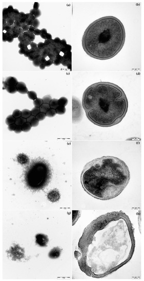 Transmission electron microscopy images of Staphylococcus epidermidis CNCTC 5671 affected by tetracycline (TET) and sodium salt of cobalt bis-dicarbollide (COSAN.Na) alone or their combination. (a) untreated control sample—negative staining; (b) untreated control sample—ultra-thin section; (c) TET 4.5 µg/mL—negative staining; (d) TET 4.5 µg/mL—ultra-thin section; (e) COSAN.Na 2.24 µg/mL—negative staining; (f) COSAN.Na 2.24 µg/mL—ultra-thin section; (g) TET 4.5 µg/mL + COSAN.Na 2.24 µg/mL—negative staining; (h) TET 4.5 µg/mL + COSAN.Na 2.24 µg/mL—ultra-thin section. Scale bar = 1 µm (a,c,e,g) or 100 nm (b,d,f,h).
