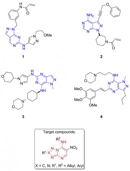 Previously, we have demonstrated that nitro group plays an essential role in the manifestation of useful biological activity of azoloazine heterocycles [17] (Figure 2). We have shown that this class possesses a wide range of antiviral actions [18,19] and an affinity toward adenosine receptors [20] that is associated with improved survival in LPS-induced septic shock [21]. Furthermore, some derivatives of this heterocycle series demonstrated higher antiglycation activity than a reference compound, aminoguanidine, and could be considered candidates for extended studies to produce drugs against complications of diabetes mellitus [22,23]. Additionally, it was shown that nitro-derivatives of this series demonstrate low toxicity [17], which is uncommon for nitro-compounds. Moreover, the nitro group is a convenient moiety for further modifications, thus making it possible to synthesize potent biologically active compounds, such as azolopurines. Additionally, the nitro group enhances NH-acidity in azolopyrimidines that permits the formation of water-soluble salts to facilitate biological evaluation.